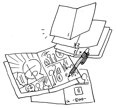 总是拘泥于画及构图,会多次重画同一页的内容,因此没有进展……对于这样的情况,最好下定决心先试试把画的部分全部推迟。首先只把台词和分格画完。同时在脑内将画补充完整,在没有台词的格子里用文字写上情况说明,这样修改起来也会很简单。以格子框线和对白框画出分镜的基础图以后,再从容易画的部分开始绘画的方法。