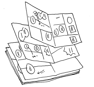 所谓迷你分镜(也称为小分镜),即将一张纸拆分小,然后画上缩小版的分镜。起到分镜中的分镜这样的作用。迷你分镜一页的空间较小,无法画出构图和角色的表情。因此修改时也很简单。这可以作为原案,这样正式画分镜时就会很顺畅了。