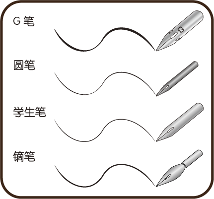 根据笔头种类的不同,下笔的触感也会不同。画漫画时,人物主线或轮廓线用G笔,头发或背景用圆笔的情况较多,但也没有明确的规定。也有人只用一种笔尖作画。